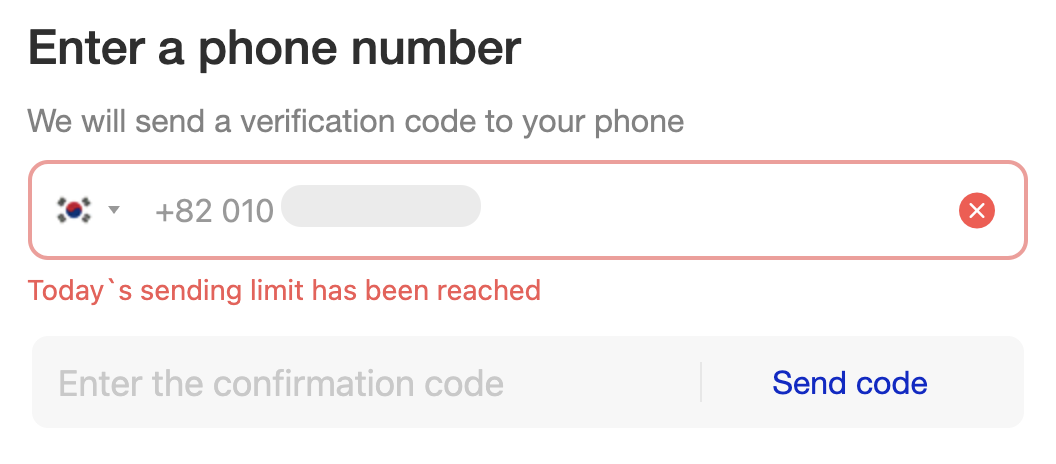 +82 010-0000-0000 휴대폰 번호를 입력하고 인증코드까지 문자로 받았습니다. 그런데 아무리 인증코드를 입력해도 코드넘버가 다르다고 합니다. 3번 정도 시도했더니 내일 다시 오래요. 확실히 제대로 입력한 것이 맞습니다. 정말 억울합니다.