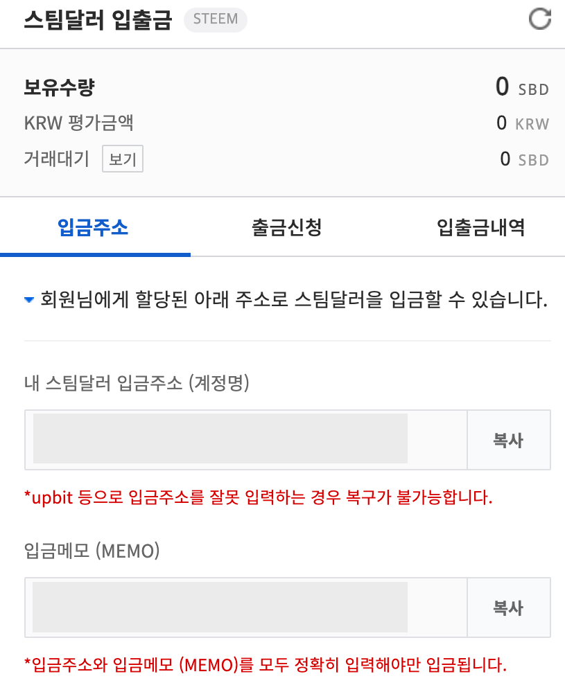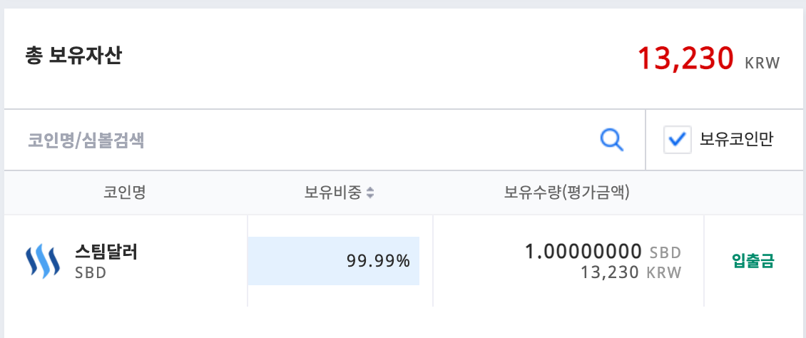 로그인을 한 후 상단 파란색 메뉴바에서 '입출금' 카테고리를 선택하세요. 검색바에 '스팀달러'를 검색하면 아래 리스트에 SBD 보유 비중과 보유 수량, 평가금액이 표시됩니다. 저는 업비트를 가입만 해 놓고 한번도 뭘 한 적이 없어서 보유비중도 수량도 금액도 모두 0입니다.